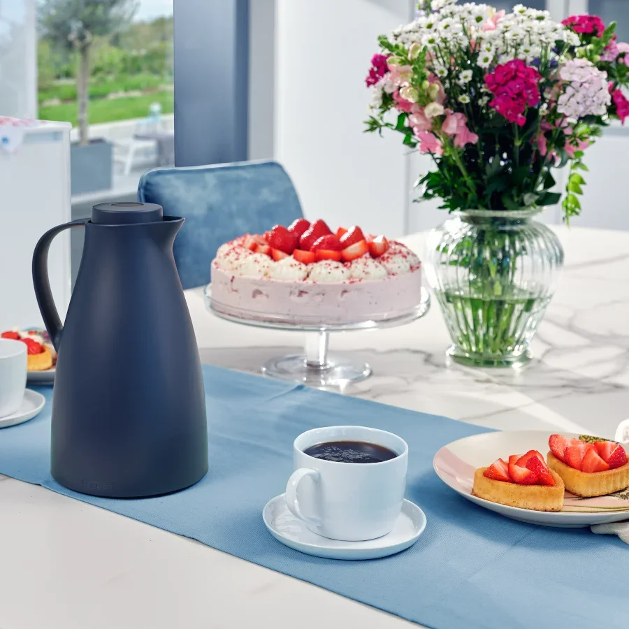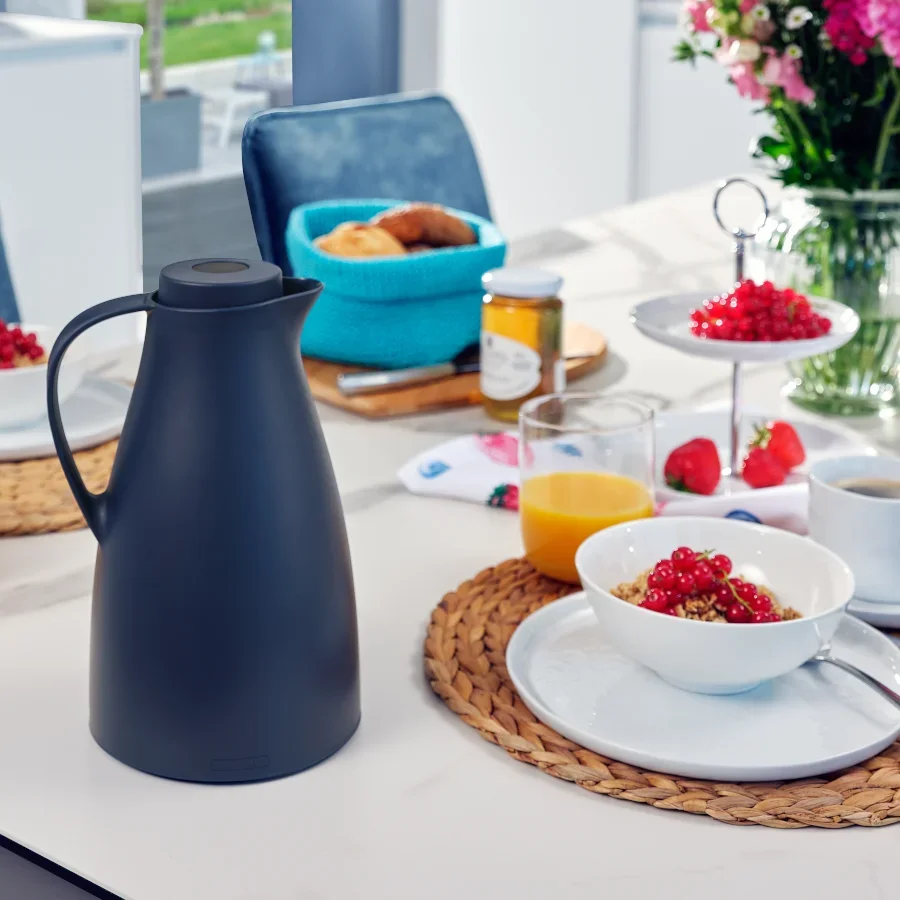 Houdt drankjes tot 24 uur warm en 36 uur koud? Geen probleem: als u de Harmonic thermoskan met 1 l inhoud in donkerblauw van Leifheit koopt, profiteert u van een optimale isolatie. Dit wordt bereikt doordat de kan een dubbelwandige glazen binnenfles heeft. Met zijn klassieke design past het model van Leifheit perfect in elk huishouden. Voor het gemakkelijk inschenken van koffie, thee en andere dranken heeft de koffiepot een gebogen schenktuit. De schroefdop is lekvrij en 100 procent lekvrij. De vacuümkan is uiteraard BPA-vrij en kan dus zonder aarzeling worden gebruikt. Dankzij het ergonomische handvat ligt de Harmonic 1 L thermosfles in donkerblauw zeer goed in de hand. Bovendien vergemakkelijkt het handvat het inschenken. De moderne sluiting is gemakkelijk te gebruiken. De hoogte van de drukknop geeft aan of de thermosfles open of gesloten is.- Kan met dubbelwandige glazen binnenfles houdt dranken 24 uur warm en 36 uur koud
