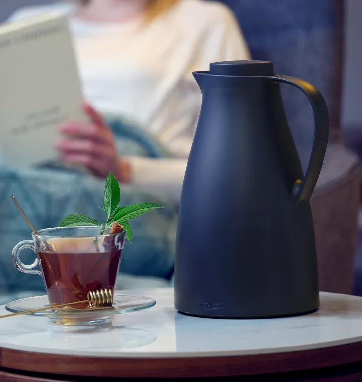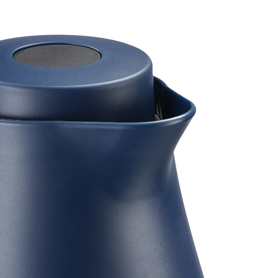 - Met moderne drukknop-sluiting, die aangeeft, of de kan open of dicht is