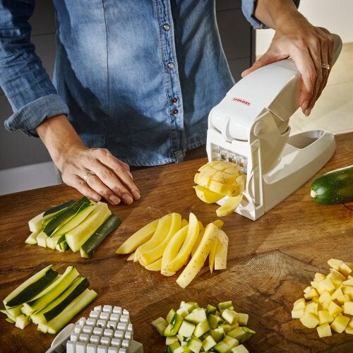 Een highlight bij ieder gerecht in een handomdraai: wie de frietsnijder koopt, kan zeer eenvoudig zelf frietjes tevoorschijn toveren. De Leifheit frietsnijder is voorzien van twee scherpe mes-inzetstukken die reepjes van 10 mm en 12 mm groot snijden. Het apparaat is niet alleen geschikt voor aardappelen, maar ook voor andere groenten zoals courgettes, komkommers of wortelen. Om het snijdwerk te vergemakkelijken is de patatsnijder uitgerust met een anti-slip softtouchzone op het handvat. Om te voorkomen dat de Leifheit frietsnijder tijdens het snijden wegglijdt, is de bodem voorzien van een antisliplaag. De aardappelsnijder is eenvoudig schoon te maken: de messen kunnen onder stromend water worden schoongespoeld. De rest van het keukengerei is vaatwasmachinebestendig.- Zeer eenvoudige bediening van de groentesnijder voor zelfgemaakte frieten of gezonde groentesticks